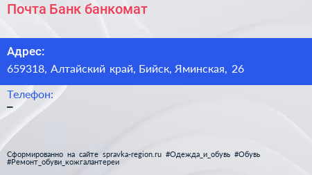 Почта Банк, банкомат по адресу 659318, Алтайский край, Бийск, Яминская, 26 в дальнейшем Организация, размещена в следующих категориях: