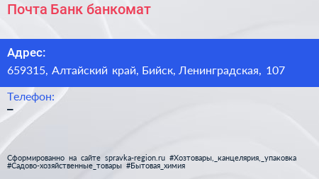 Почта Банк, банкомат по адресу 659315, Алтайский край, Бийск, Ленинградская, 107 в дальнейшем Организация, размещена в следующих категориях: