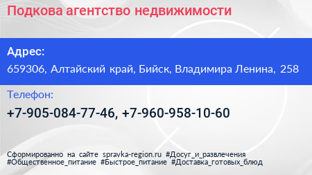 Подкова, агентство недвижимости по адресу 659306, Алтайский край, Бийск, Владимира Ленина, 258 в дальнейшем Организация, размещена в следующих категориях: