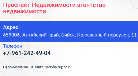 Проспект Недвижимости, агентство недвижимости по адресу 659306, Алтайский край, Бийск, Кожевенный переулок, 11 в дальнейшем Организация, размещена в следующих категориях: