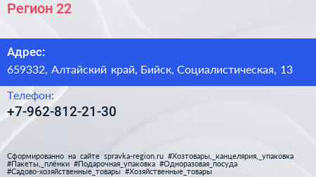 Регион 22 по адресу 659332, Алтайский край, Бийск, Социалистическая, 13 в дальнейшем Организация, размещена в следующих категориях:
