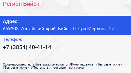Регион Бийск по адресу 659303, Алтайский край, Бийск, Петра Мерлина, 27 в дальнейшем Организация, размещена в следующих категориях: