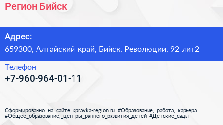 Регион Бийск по адресу 659300, Алтайский край, Бийск, Революции, 92 лит2 в дальнейшем Организация, размещена в следующих категориях: