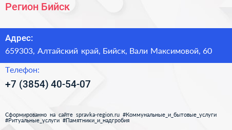 Регион Бийск по адресу 659303, Алтайский край, Бийск, Вали Максимовой, 60 в дальнейшем Организация, размещена в следующих категориях: