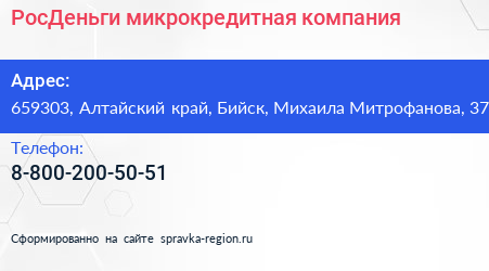 РосДеньги, микрокредитная компания по адресу 659303, Алтайский край, Бийск, Михаила Митрофанова, 37 в дальнейшем Организация, размещена в следующих категориях: