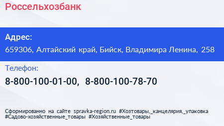 Россельхозбанк по адресу 659306, Алтайский край, Бийск, Владимира Ленина, 258 в дальнейшем Организация, размещена в следующих категориях: