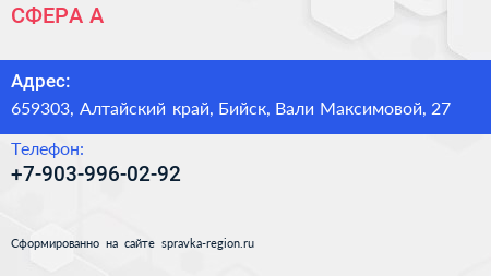 СФЕРА А по адресу 659303, Алтайский край, Бийск, Вали Максимовой, 27 в дальнейшем Организация, размещена в следующих категориях: