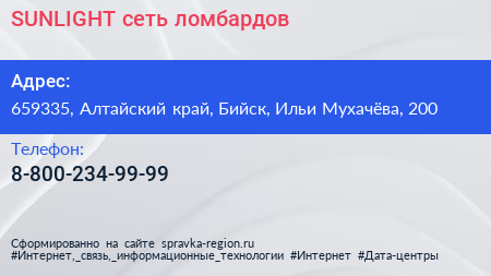 SUNLIGHT, сеть ломбардов по адресу 659335, Алтайский край, Бийск, Ильи Мухачёва, 200 в дальнейшем Организация, размещена в следующих категориях: