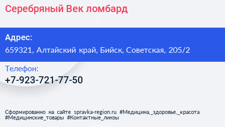 Серебряный Век, ломбард по адресу 659321, Алтайский край, Бийск, Советская, 205/2 в дальнейшем Организация, размещена в следующих категориях: