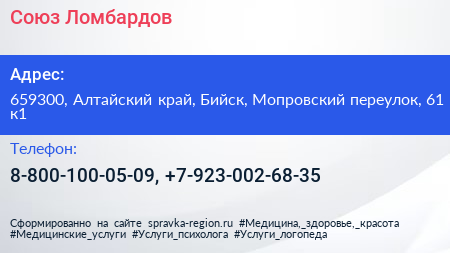 Союз Ломбардов по адресу 659300, Алтайский край, Бийск, Мопровский переулок, 61 к1 в дальнейшем Организация, размещена в следующих категориях: