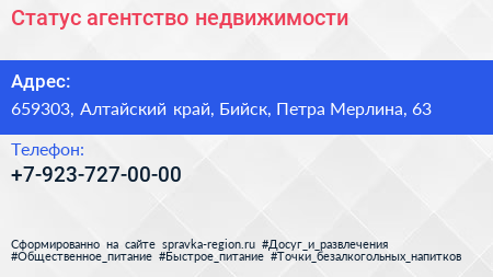 Статус, агентство недвижимости по адресу 659303, Алтайский край, Бийск, Петра Мерлина, 63 в дальнейшем Организация, размещена в следующих категориях: