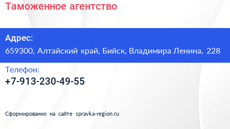 Таможенное агентство по адресу 659300, Алтайский край, Бийск, Владимира Ленина, 228 в дальнейшем Организация, размещена в следующих категориях: