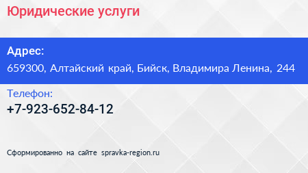 Юридические услуги по адресу 659300, Алтайский край, Бийск, Владимира Ленина, 244 в дальнейшем Организация, размещена в следующих категориях:
