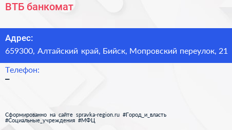 ВТБ, банкомат по адресу 659300, Алтайский край, Бийск, Мопровский переулок, 21 в дальнейшем Организация, размещена в следующих категориях: