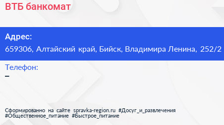 ВТБ, банкомат по адресу 659306, Алтайский край, Бийск, Владимира Ленина, 252/2 в дальнейшем Организация, размещена в следующих категориях: