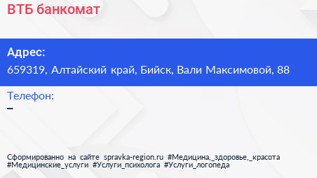 ВТБ, банкомат по адресу 659319, Алтайский край, Бийск, Вали Максимовой, 88 в дальнейшем Организация, размещена в следующих категориях: