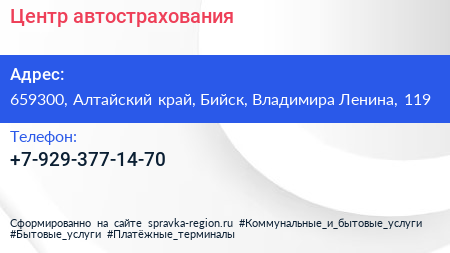 Центр автострахования по адресу 659300, Алтайский край, Бийск, Владимира Ленина, 119 в дальнейшем Организация, размещена в следующих категориях: