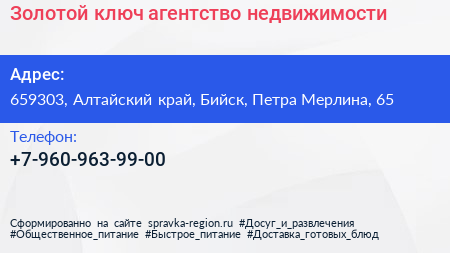 Золотой ключ, агентство недвижимости по адресу 659303, Алтайский край, Бийск, Петра Мерлина, 65 в дальнейшем Организация, размещена в следующих категориях: