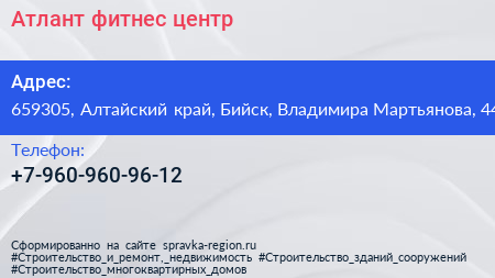 Атлант, фитнес-центр по адресу 659305, Алтайский край, Бийск, Владимира Мартьянова, 44 в дальнейшем Организация, размещена в следующих категориях: