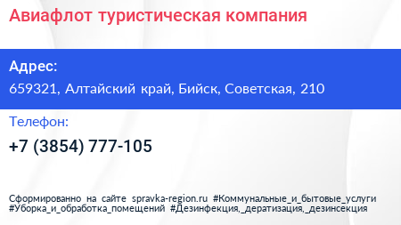 Авиафлот, туристическая компания по адресу 659321, Алтайский край, Бийск, Советская, 210 в дальнейшем Организация, размещена в следующих категориях: