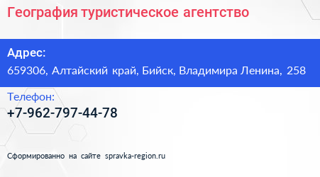 География, туристическое агентство по адресу 659306, Алтайский край, Бийск, Владимира Ленина, 258 в дальнейшем Организация, размещена в следующих категориях: