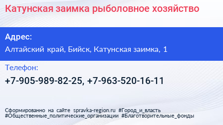 Катунская заимка, рыболовное хозяйство по адресу Алтайский край, Бийск, Катунская заимка, 1 в дальнейшем Организация, размещена в следующих категориях: