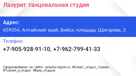 Лазурит, танцевальная студия по адресу 659354, Алтайский край, Бийск, площадь Щигарева, 2 в дальнейшем Организация, размещена в следующих категориях: