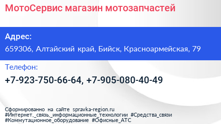 МотоСервис, магазин мотозапчастей по адресу 659306, Алтайский край, Бийск, Красноармейская, 79 в дальнейшем Организация, размещена в следующих категориях: