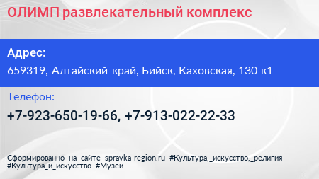 ОЛИМП, развлекательный комплекс по адресу 659319, Алтайский край, Бийск, Каховская, 130 к1 в дальнейшем Организация, размещена в следующих категориях: