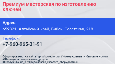 Премиум, мастерская по изготовлению ключей по адресу 659321, Алтайский край, Бийск, Советская, 218 в дальнейшем Организация, размещена в следующих категориях: