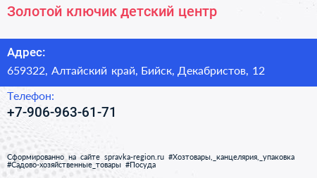 Золотой ключик, детский центр по адресу 659322, Алтайский край, Бийск, Декабристов, 12 в дальнейшем Организация, размещена в следующих категориях: