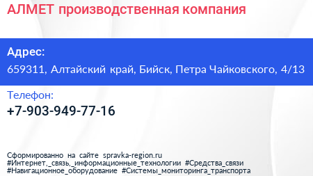 АЛМЕТ, производственная компания по адресу 659311, Алтайский край, Бийск, Петра Чайковского, 4/13 в дальнейшем Организация, размещена в следующих категориях: