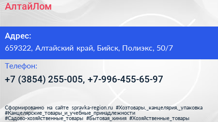 АлтайЛом по адресу 659322, Алтайский край, Бийск, Полиэкс, 50/7 в дальнейшем Организация, размещена в следующих категориях: