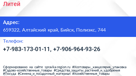 Литей по адресу 659322, Алтайский край, Бийск, Полиэкс, 744 в дальнейшем Организация, размещена в следующих категориях: