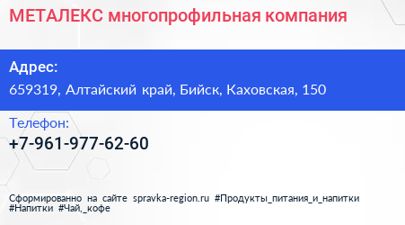 МЕТАЛЕКС, многопрофильная компания по адресу 659319, Алтайский край, Бийск, Каховская, 150 в дальнейшем Организация, размещена в следующих категориях:
