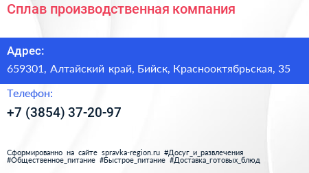 Сплав, производственная компания по адресу 659301, Алтайский край, Бийск, Краснооктябрьская, 35 в дальнейшем Организация, размещена в следующих категориях: