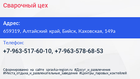 Сварочный цех по адресу 659319, Алтайский край, Бийск, Каховская, 149а в дальнейшем Организация, размещена в следующих категориях: