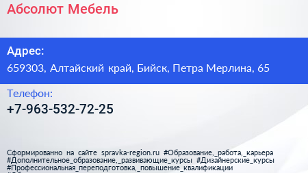 Абсолют Мебель по адресу 659303, Алтайский край, Бийск, Петра Мерлина, 65 в дальнейшем Организация, размещена в следующих категориях: