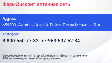 ФармДисконт, аптечная сеть по адресу 659303, Алтайский край, Бийск, Петра Мерлина, 51а в дальнейшем Организация, размещена в следующих категориях:
