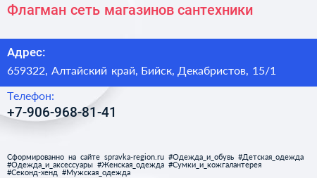 Флагман, сеть магазинов сантехники по адресу 659322, Алтайский край, Бийск, Декабристов, 15/1 в дальнейшем Организация, размещена в следующих категориях: