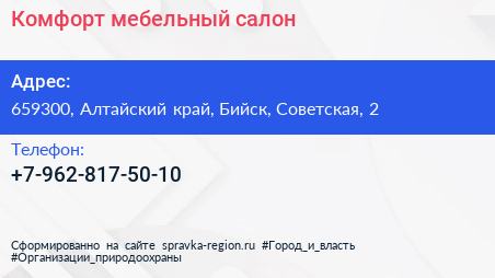 Комфорт, мебельный салон по адресу 659300, Алтайский край, Бийск, Советская, 2 в дальнейшем Организация, размещена в следующих категориях: