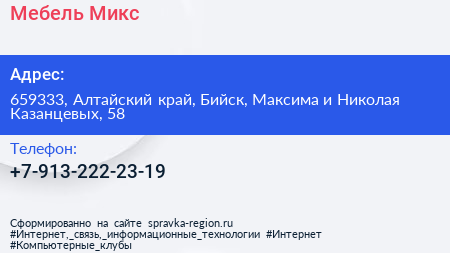 Мебель-Микс по адресу 659333, Алтайский край, Бийск, Максима и Николая Казанцевых, 58 в дальнейшем Организация, размещена в следующих категориях: