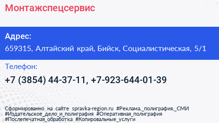 Монтажспецсервис по адресу 659315, Алтайский край, Бийск, Социалистическая, 5/1 в дальнейшем Организация, размещена в следующих категориях: