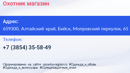 Охотник, магазин по адресу 659300, Алтайский край, Бийск, Мопровский переулок, 65 в дальнейшем Организация, размещена в следующих категориях: