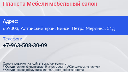 Планета Мебели, мебельный салон по адресу 659303, Алтайский край, Бийск, Петра Мерлина, 51д в дальнейшем Организация, размещена в следующих категориях: