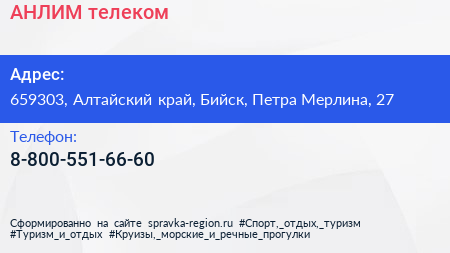 АНЛИМ телеком по адресу 659303, Алтайский край, Бийск, Петра Мерлина, 27 в дальнейшем Организация, размещена в следующих категориях: