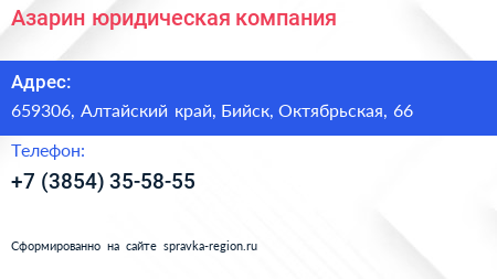 Азарин, юридическая компания по адресу 659306, Алтайский край, Бийск, Октябрьская, 66 в дальнейшем Организация, размещена в следующих категориях: