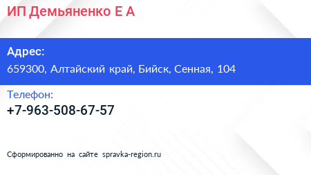 ИП Демьяненко Е.А. по адресу 659300, Алтайский край, Бийск, Сенная, 104 в дальнейшем Организация, размещена в следующих категориях: