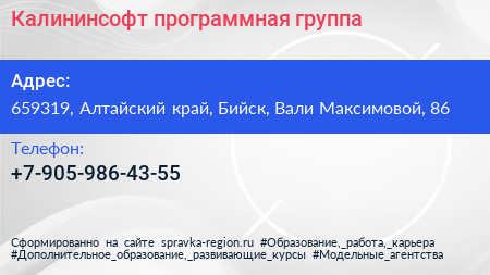 Калининсофт, программная группа по адресу 659319, Алтайский край, Бийск, Вали Максимовой, 86 в дальнейшем Организация, размещена в следующих категориях: