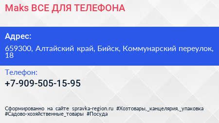 Maks ВСЕ ДЛЯ ТЕЛЕФОНА по адресу 659300, Алтайский край, Бийск, Коммунарский переулок, 18 в дальнейшем Организация, размещена в следующих категориях: